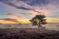 Prachtige kleuren in de lucht met net boven de grond wat mist. De heide is bijna uitgebloeid maar geeft nog net wat kleur. De karakteristieke bomen geven met hun silhouet diepte aan het beeld.