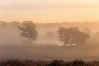 Prachtige kleuren in de lucht met net boven de grond wat mist. De heide is bijna uitgebloeid maar geeft nog net wat kleur. De karakteristieke bomen geven met hun silhouet diepte aan het beeld.