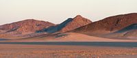 Het rode gesteente en het rode zand worden extra uitgelicht door het schijnsel van de opkomende zon.