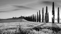 Een zwart-wit foto van een zonsopkomst bij Agriturismo Poggio Covili, een bekende fotolocatie door de rij cipres bomen, gelegen in Val d'Orcia, Toscane, Italië.