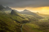 Prachtig licht van de opkomende zon en regenbuien over het prachtige landschap van de Quiraing op het eiland Skye in Schotland.