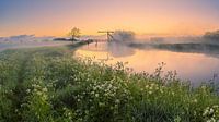 Een 16:9 foto van een mistige en sfeervolle zonsopkomst in de lente met fluitenkruid bij de houten voetgangersbrug Schildjer Tilbat over het Afwateringskanaal van Duurswold ten zuidwesten van het Schildmeer bij het gehucht “De Paauwen” (Overschild), gelegen in de gemeente midden-Groningen in de provincie Groningen.