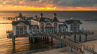 Zonsopkomst bij de Sellin Pier, een pier in de Baltische badplaats Sellin op het Duitse eiland Rügen. De pier heeft een restaurant vlakbij het strand boven het water en heeft een duikgondel.