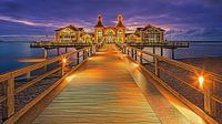 Een digitale olieverf bewerking van een zonsopkomst bij de Sellin Pier in de Baltische badplaats Sellin op het Duitse eiland Rügen. De pier heeft een restaurant vlakbij het strand boven het water en heeft een duikgondel.
