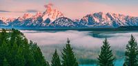 Zonsopgang vanaf de Snake River met uitzicht op de bergen van het Grand Teton National Park massief in het noord westen van Wyoming, Verenigde Staten.
