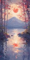 Een vredige zonsopkomst schildert de lucht in zachte pasteltinten boven een rustig bergmeer. Bladeren die beginnen te kleuren in herfsttinten omlijsten het serene landschap, waar de berg majestueus zijn reflectie toont in het stille water.