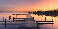 Een 2:1 foto van een zonsopkomst in de winter aan het Leekstermeer, bij de aanlegsteigers van het Cnossen Paviljoen.