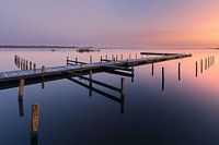 Een zonsopkomst in de winter aan het Leekstermeer, bij de aanlegsteigers van het Cnossen Paviljoen.