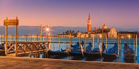 Een horizontale 2:1 foto van een zonsopgang in Venetië met het uitzicht vanaf het beroemde San Marcoplein met de Gondels en het uitzicht naar de kerk van San Giorgio Maggiore.