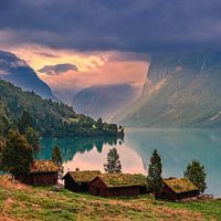 Een vierkante 1:1 foto van een zonsopkomst met oude boerderijen in de voorgrond aan Lovatnet, een meer in de Lodalen-vallei, nabij bij het dorp Loen in de provincie Vestland, Noorwegen.