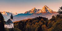 Een 2:1 panorama foto tijdens zonsopkomst bij de Pelgrimskerk Maria Gern, met uitzicht op de berg Watzmann, nabij de stad Berchtesgaden, in Beieren, Zuid-Duitsland.