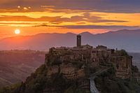 Een zonsopkomst bij Civita di Bagnoregio, een afgelegen dorp in de gemeente Bagnoregio in de provincie Viterbo, Lazio, in Midden-Italië.
