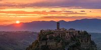 Een foto in 2:1 formaat van een zonsopkomst bij Civita di Bagnoregio, een afgelegen dorp in de gemeente Bagnoregio in de provincie Viterbo, Lazio, in Midden-Italië.