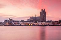 Zonsopkomst bij Dordrecht met de grote kerk op de achtergrond.