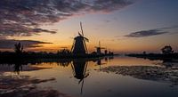 Zonopkomst bij Kinderdijk. Doordat het windstil was hebben de rood-paarse wolken een perfecte reflectie in het water. De bekende rij met molens wordt daarom op een mooie manier geaccentueerd.