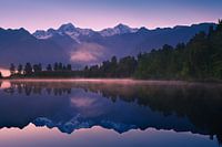 Een sfeervolle serene zonsopkomst met warme kleurtinten bij Lake Matheson op het Zuidereiland van Nieuw-Zeeland.