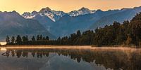 Een 2:1 formaat foto van een zonsopkomst bij Lake Matheson, een klein gletsjermeer in het Zuid-Westland, Nieuw-Zeeland, in de buurt van de gemeente Fox Glacier. Een gemakkelijk wandelpad omcirkelt het meer, dat beroemd is om zijn weerspiegelde uitzichten op Aoraki / Mount Cook en Mount Tasman.