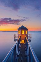 Een verticale foto van zonsopkomst in de zomer bij de vuurtoren in Oostmahorn. De benaming vuurtoren is hier echter niet op zijn plaats, het is namelijk een Peilschaal (Nautisch monument), een waterstandsmeetpunt aan het Lauwersmeer.