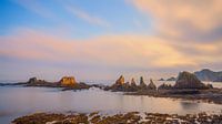 Een 16:9 foto met een 4 minuten belichting tijdens zonsopkomst op het strand van Gueirua, een kleine baai met kiezels die vooral opvalt door het prachtige landschap.