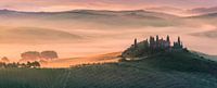 Podere Belvedere bij zonsopgang. De ochtendmist en de zonsopgang maken dit een van de mooiste vergezichten in Val d'Orcia in Toscane, Italië.