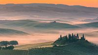 Het beroemde Podere Belvedere in ochtendlicht, in het hart van Toscane, tussen Pienza en San Quirico in de Val d'Orcia in Midden-Italië.