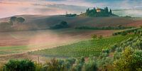 Panorama foto van Podere Belvedere in ochtendlicht, in het hart van Toscane, in de buurt van Pienza en San Quirico in de Val d'Orcia, Italië.