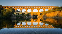 Een 16:9 foto van een zonsopkomst bij Pont Du Gard, een Romeins aquaduct over de Gardon rivier. Het bouwwerk ligt bij het stadje Vers-Pont-du-Gard, een gemeente in het Franse departement Gard.