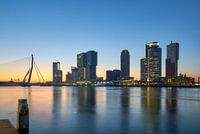 Rotterdam voor de zonsopkomst. De stad is verbazingwekkend stil nog. De skyline met de Erasmusbrug en De Rotterdam steekt mooi af tegen de lucht. De naderende zon kleurt de lucht oranje. De verlichting in de gebouwen kleuren mooi samen met de zonsopkomst.