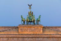 Zonsopkomst bij de Brandenburger Tor, een 18e-eeuws neoklassiek monument in Berlijn, Duitsland. Bovenop de poort staat een Quadriga, een strijdwagen getrokken door vier paarden, aangedreven door Victoria, de Romeinse godin van de overwinning.