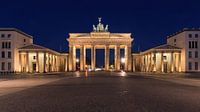 Zonsopkomst bij de Brandenburger Tor, een 18e-eeuws neoklassiek monument in Berlijn, Duitsland. Bovenop de poort staat een Quadriga, een strijdwagen getrokken door vier paarden, aangedreven door Victoria, de Romeinse godin van de overwinning.