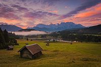 Zonsopkomst en ochtendnevel bij de Geroldsee met het Karwendelgebergte in de achtergrond. Geroldsee (officiele naam Wagenbruchsee) is gelegen tussen Garmisch-Partenkirchen en Mittenwald in de deelstaat Beieren, in het zuiden van Duitsland.