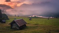 Zonsopkomst en ochtendnevel bij de Geroldsee met het Karwendelgebergte in de achtergrond. Geroldsee (officiele naam Wagenbruchsee) is gelegen tussen Garmisch-Partenkirchen en Mittenwald in de deelstaat Beieren, in het zuiden van Duitsland.