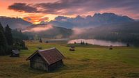 Zonsopkomst en ochtendnevel bij de Geroldsee met het Karwendelgebergte in de achtergrond. Geroldsee (officiele naam Wagenbruchsee) is gelegen tussen Garmisch-Partenkirchen en Mittenwald in de deelstaat Beieren, in het zuiden van Duitsland.