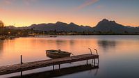 Herfst en zonsopkomst met herfstkleuren bij de Hopfensee, gelegen bij de plaats bij Hopfen am See, met de Allgäur Alpen in de achtergrond.