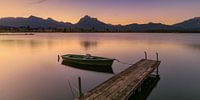 Herfst en zonsopkomst met herfstkleuren bij de Hopfensee, gelegen bij de plaats bij Hopfen am See, met de Allgäur Alpen in de achtergrond.