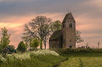 Een foto met een 4 minuten belichting van een zonsopkomst in de lente met zachtgele kleuren en fluitenkruid bij de Mauritiuskerk in Marsum (voormalig gemeente Appingedam), Eemsdelta, Groningen.