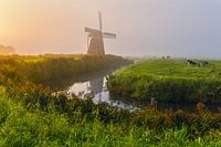 Een 2:3 foto van een mistige zonsopkomst bij poldermolen de Meervogel in Hoeksmeer, gebouwd in 1801 voor het bemalen van de Noorder Hoeksmeersterpolder.