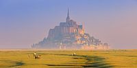 Een 2:1 foto met schapen in voorgrond op een vroege zonsopkomst met een laagje ochtendmist bij de beroemde Mont Saint-Michel, staand aan de westkust van Frankrijk in Normandië.