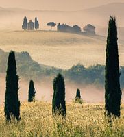 Een verticale 4:5 foto van een sfeervolle en mistige zonsopkomst met tegenlicht de "Cappella della Madonna di Vitaleta", in het hart van Toscane, gelegen tussen de dorpen Pienza en San Quirico in de Val d'Orcia in Midden-Italië.