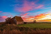 Een mooie zonskomst boven een van de bekendste schuurtjes, ook wel schapenboot geheten, op Texel.