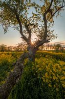 Prachtige zonsopkomst bij een oude grillige fruitboom tussen het koolzaad. Een betoverende plek waar geschiedenis en natuur samenkomen.