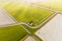 De opkomende zon verlicht het 'Brintahuisje' vlakbij Warffum in de provincie Groningen. De slagschaduws van de bomen zorgen voor mooie silhouetten in het weiland.