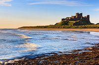 Zonsopkomst bij het kasteel van Bamburgh, staand in de duinen aan het strand van Bamburgh, uitkijkend over de Noordzee in het district Northumberland, aan de ooskust van Engeland.