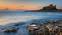 Een 16:9 foto van een zonsopkomst bij het kasteel van Bamburgh, staand in de duinen aan het strand van Bamburgh, uitkijkend over de Noordzee in het district Northumberland, aan de ooskust van Engeland.