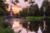 In een vroege ochtend, met de opkomende zon in de verte, ontstaat er een prachtig kleurrijk tafereel. Warme tinten en een nog leeg park, dat overdag kan bruisen van levendigheid.