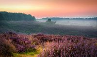 Zonsopkomst boven de Veluwe. De heide staat in bloei bij de Posbank, Nationaal Park Veluwezoom. Boven de heuvels in de verte hangt een mooi ochtendnevel. De lucht is roze. Het gebied is hier heuvelachtig waardoor je een mooi uitzicht hebt over de omgeving. Vooral in augustus is het kleurrijk als de heide in bloei staat.