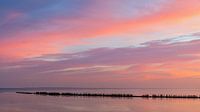 Zonsopkomst boven de Waddenzee tijdens eb met paaltjes, nabij het dorp Wierum in de provincie Friesland in het noorden van Nederland.