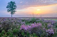 Bloeiende heide bij de Renderklippen op de Veluwe tijdens zonsopkomst. Mist stijgt op vanaf de grond bij de eerste zonnestralen aan het begin van deze zomerse dag in augustus.