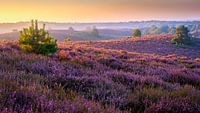 Zonsopkomst boven de bloeiende heide. De zon is net op, het licht werpt lange schaduwen over de heide die in bloei staat, half augustus. Een hoog uitzichtpunt bij de Posbank, Hoge Veluwe.