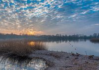 Zonsopkomst met mooie wolkenformatie boven het meer in natuurdomein Bergelen in Moorsele/Gullegem, België. Op de voorgrond een 'natuurlijke' steiger met rieten begroeiing.